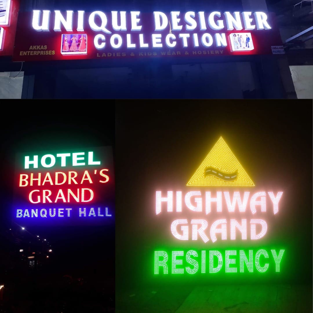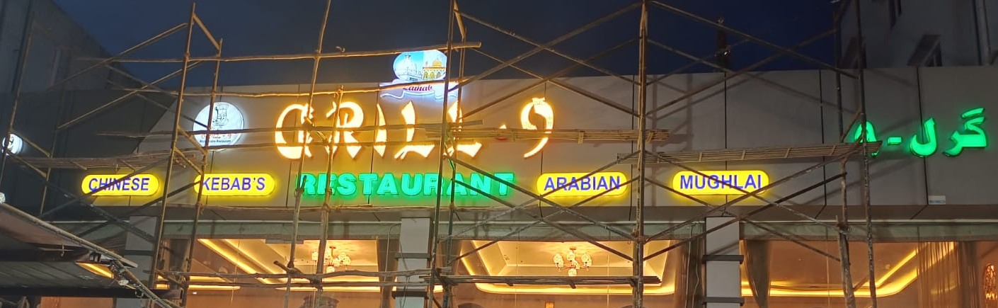 Being a progressive company, we constantly strive to find new concepts for our clients. We are continually developing new Building Hoarding Fabrication, LED Sign Boards, Pixel LED Sign Boards, Neon Sign Boards, Neon Box Letters, Interior Ceiling Lighting Solutions, Building Name Signage, Stainless Steel Letters, Metal Powder Coating Letters, Acrylic Sign Boards, ACP Sheet Sign Boards and all types of fabrication works.